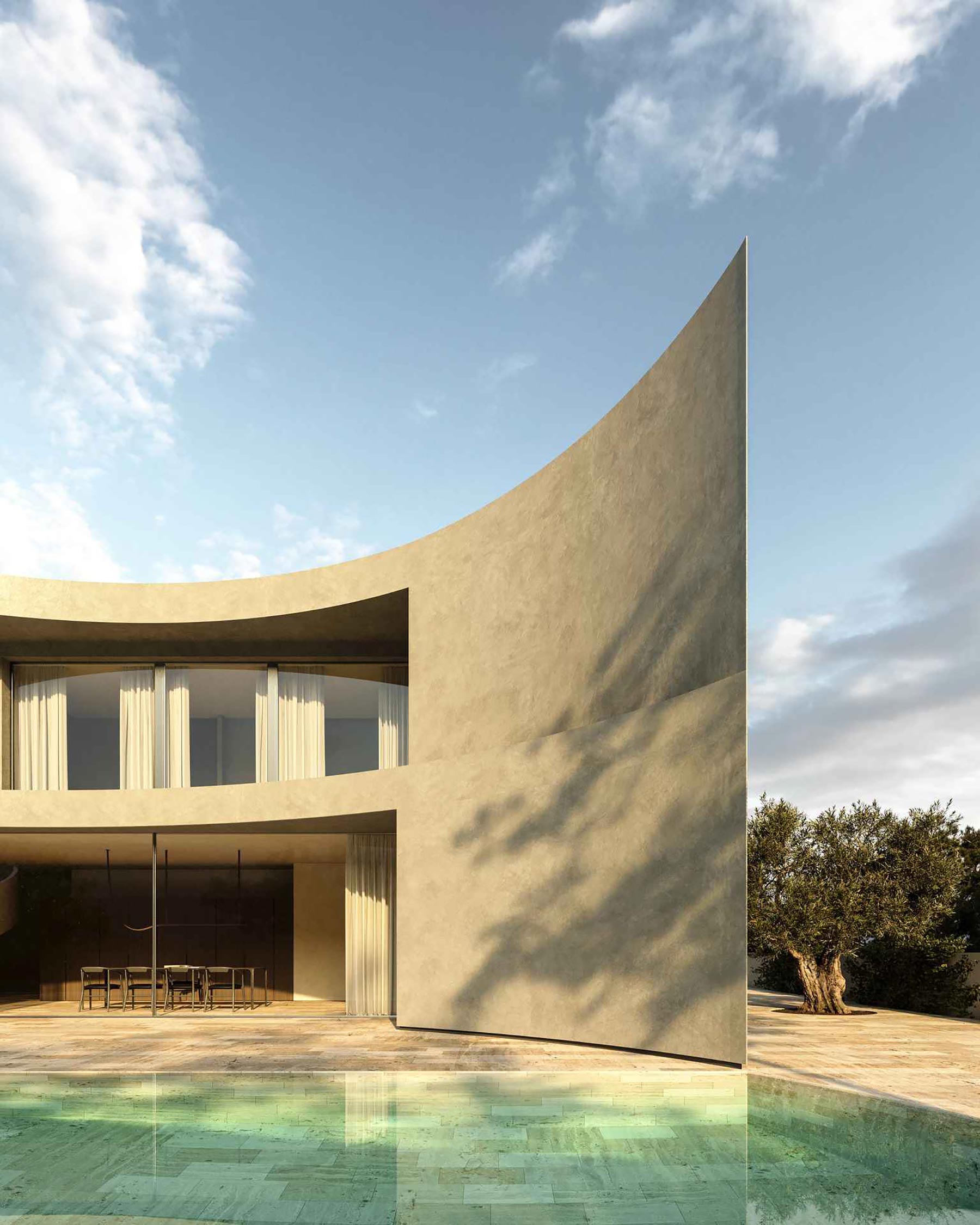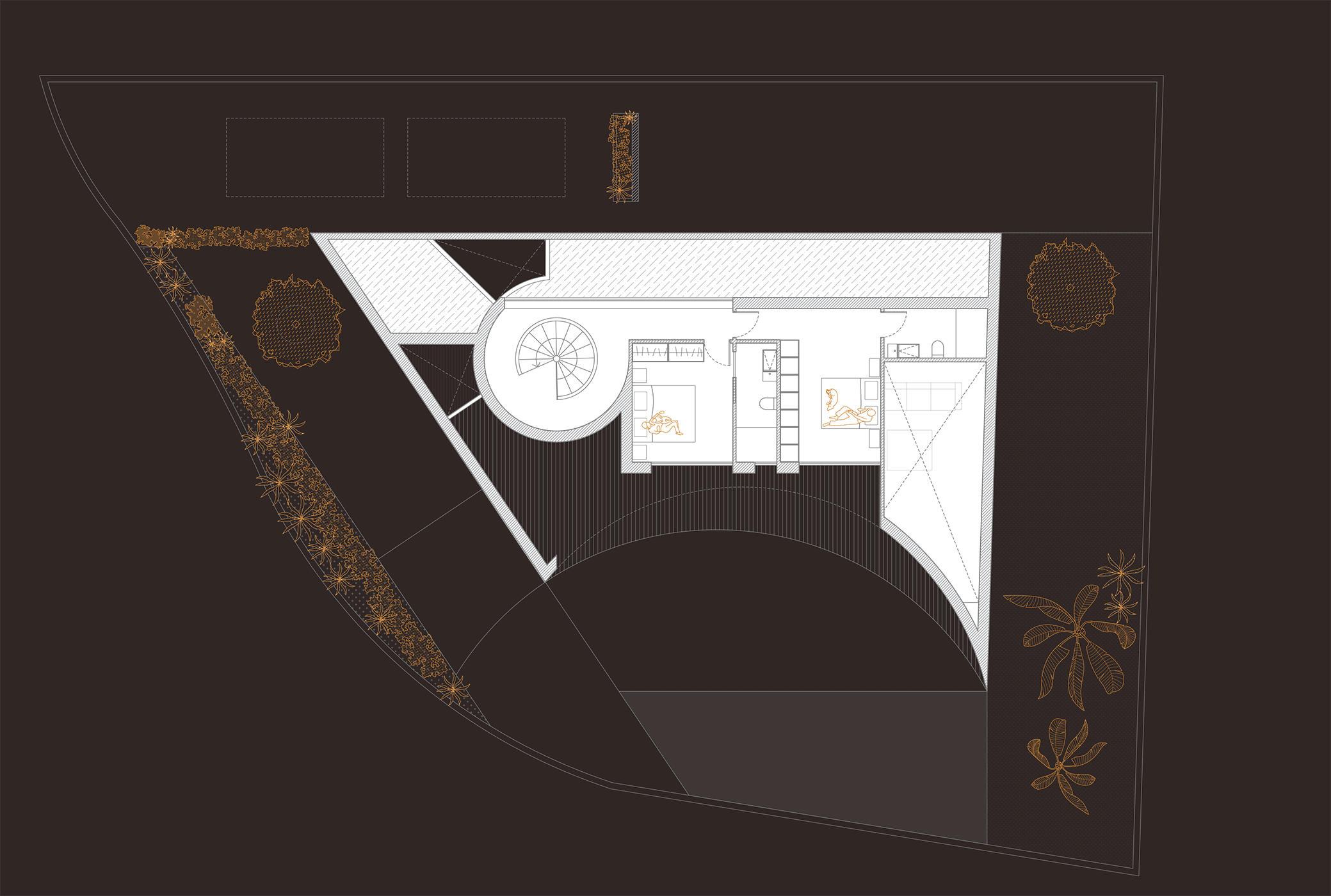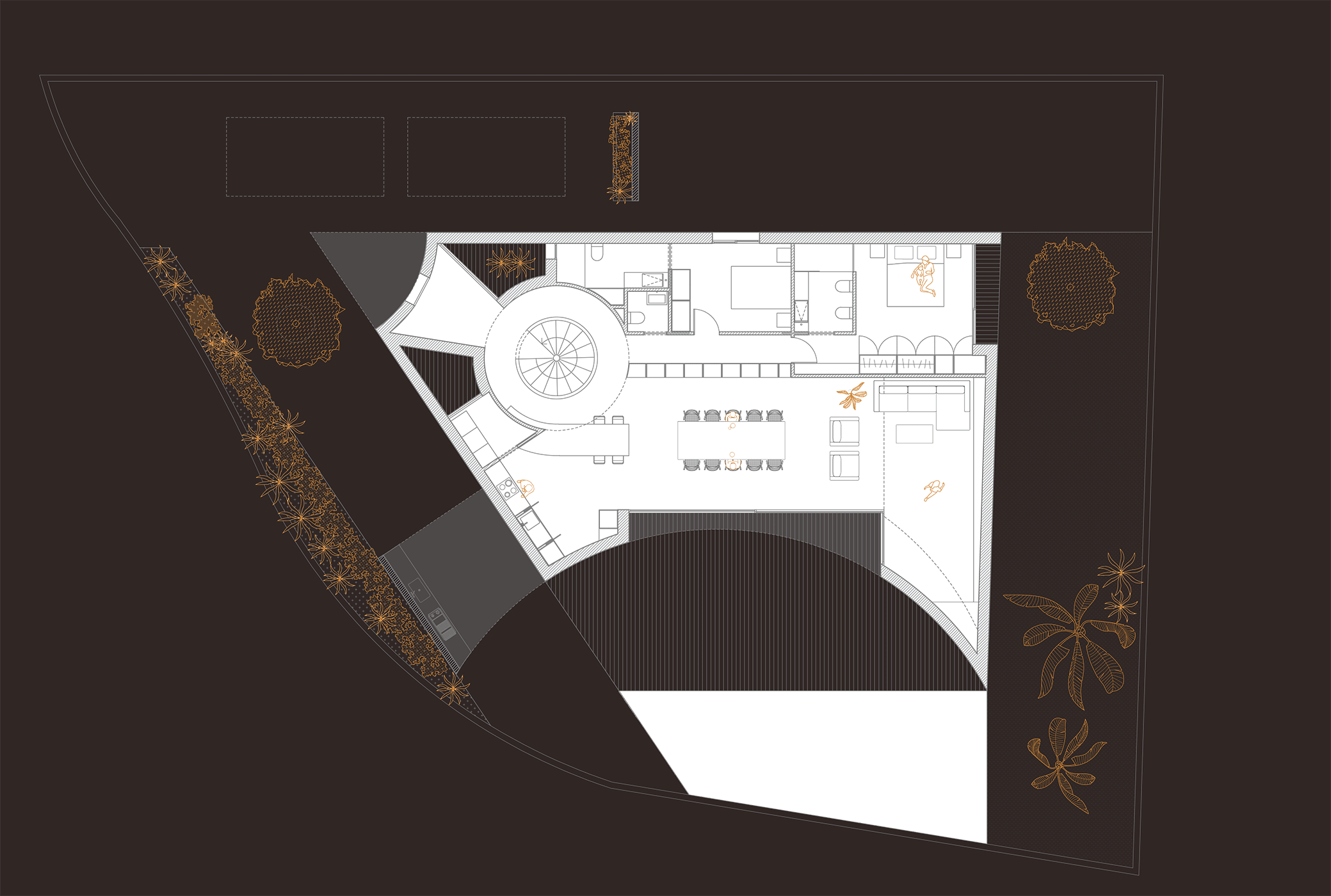 Para aprovechar al máximo el espacio de parcela, se genera una vivienda triangular a la que se le resta un hueco en planta producido por una circunferencia, que, además de dar forma a la fachada y convertirse en el elemento diferenciador de la vivienda, permite abrir la casa hacia el exterior y permitir una conexión directa y fluida entre ambos espacios.