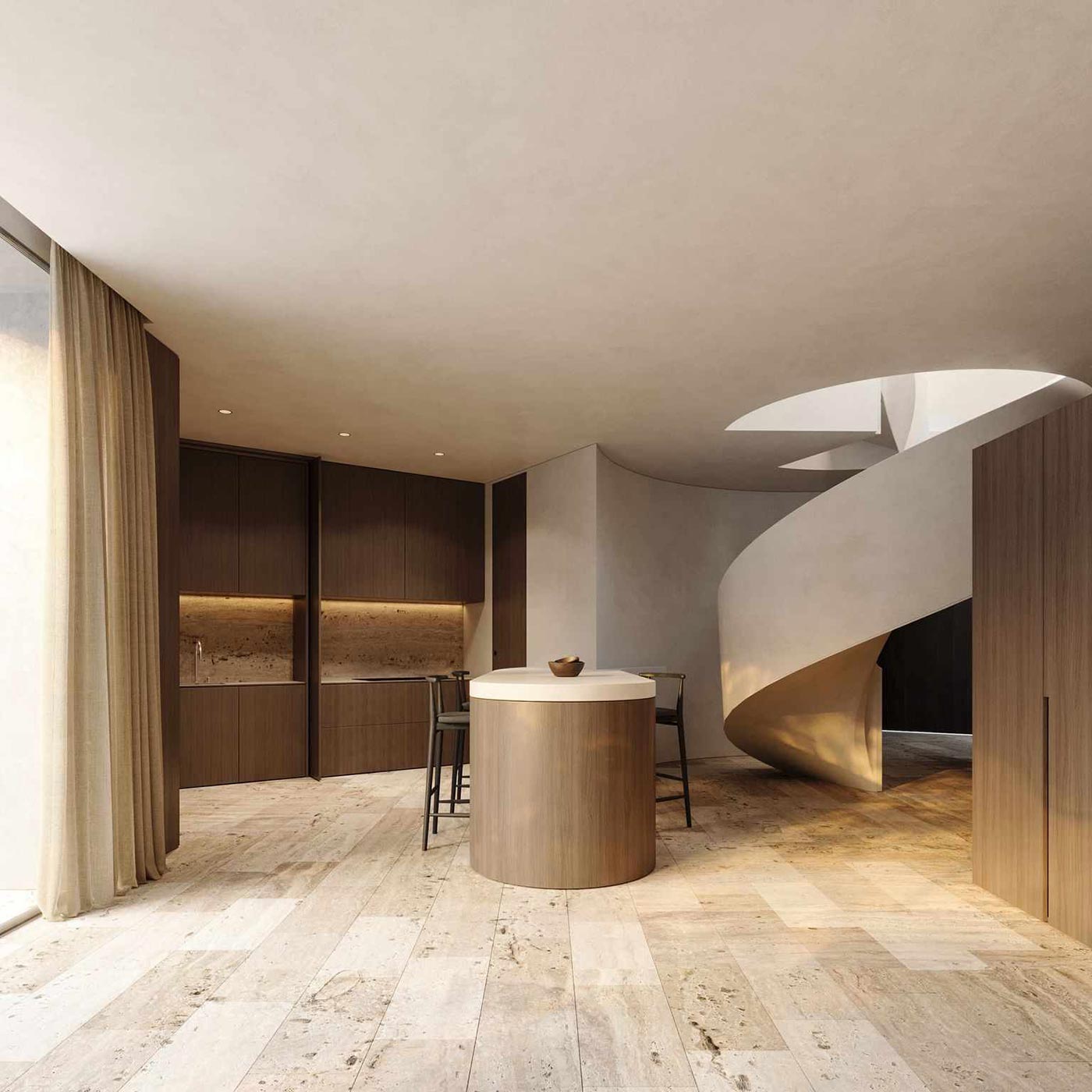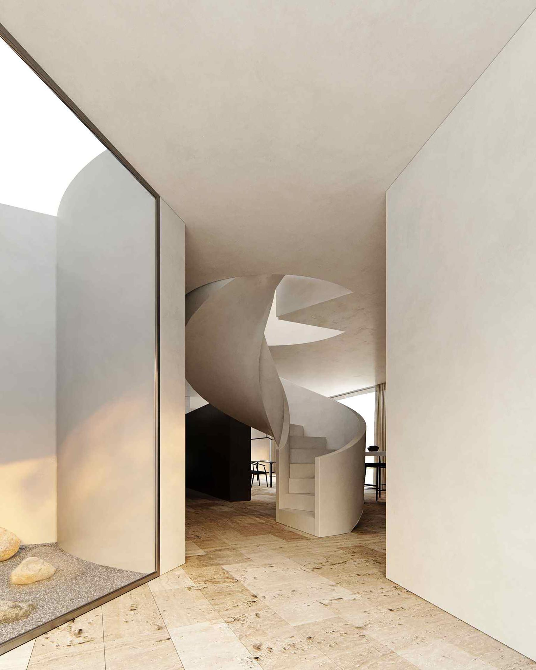 Al adentrarnos en esta casa, nos encontramos con la escalera de obra de caracol, que destaca como una estructura emblemática en la entrada de la vivienda. Esta escalera no solo cumple su función de conexión entre los diferentes niveles, sino que también se convierte en un elemento arquitectónico identitario, aportando personalidad y distinción al diseño general.