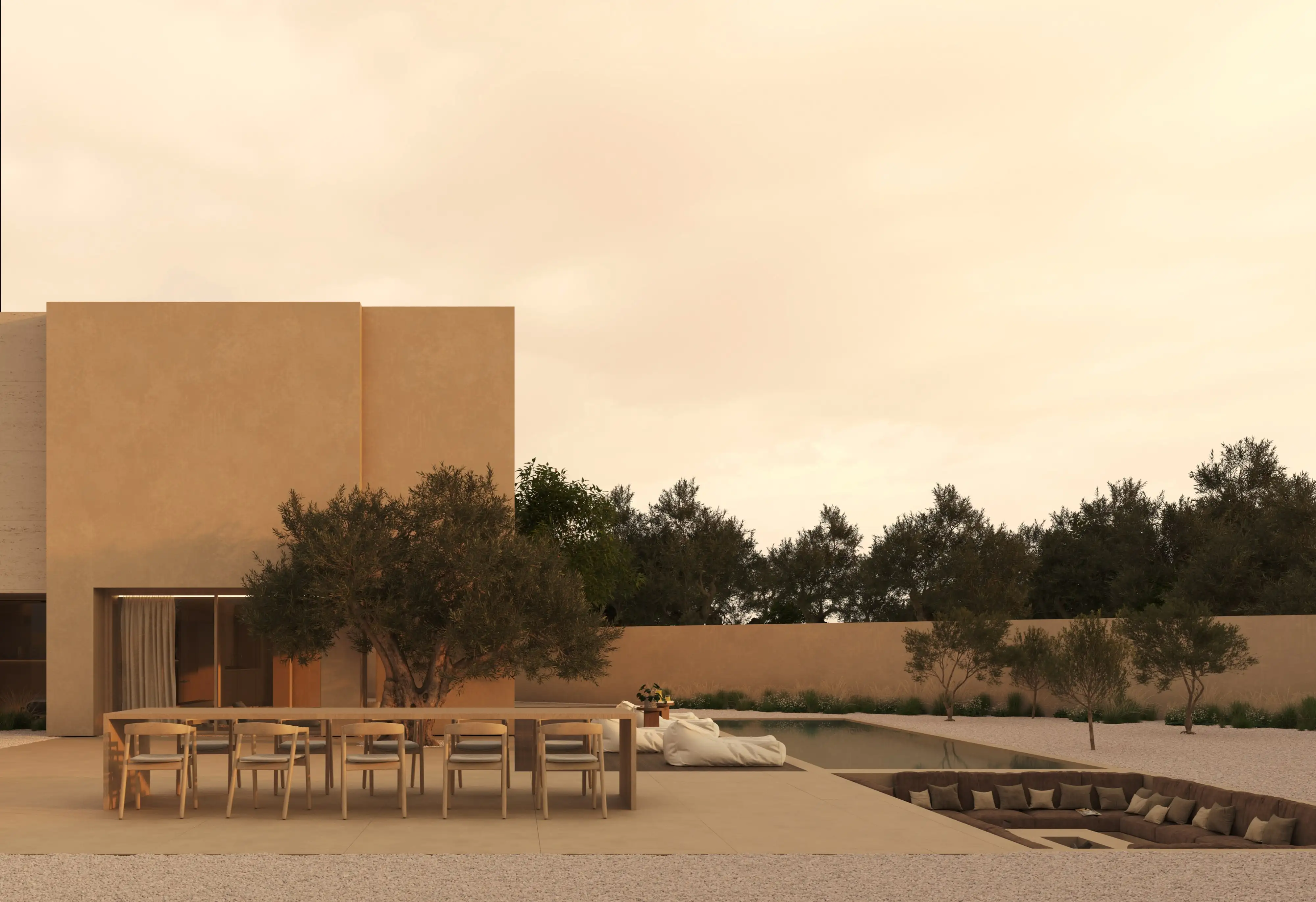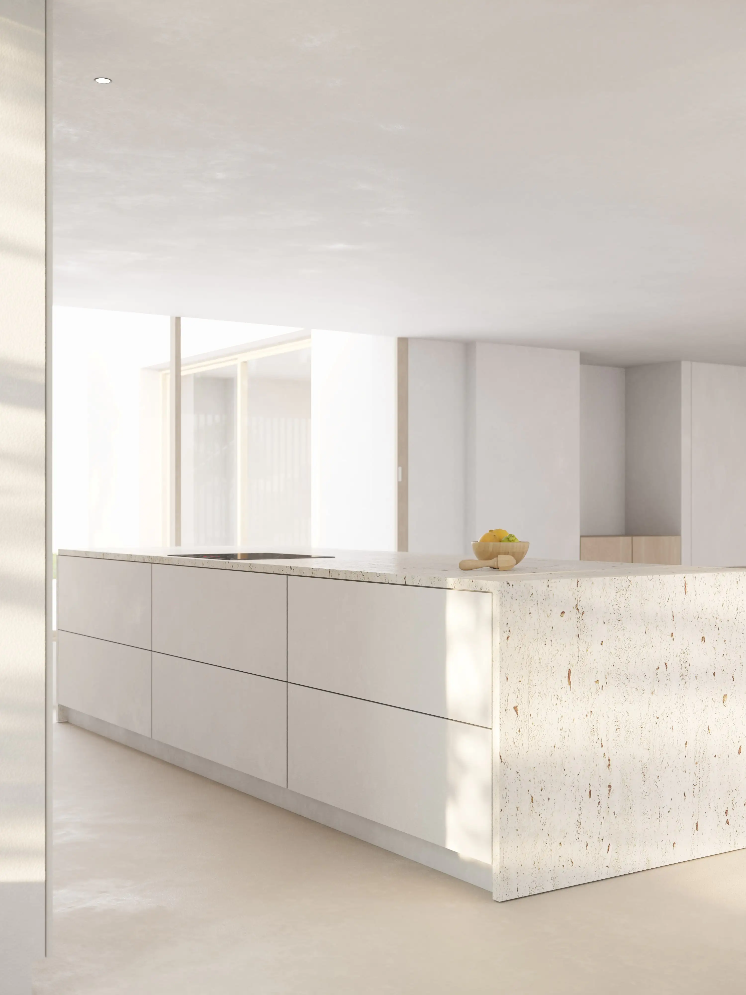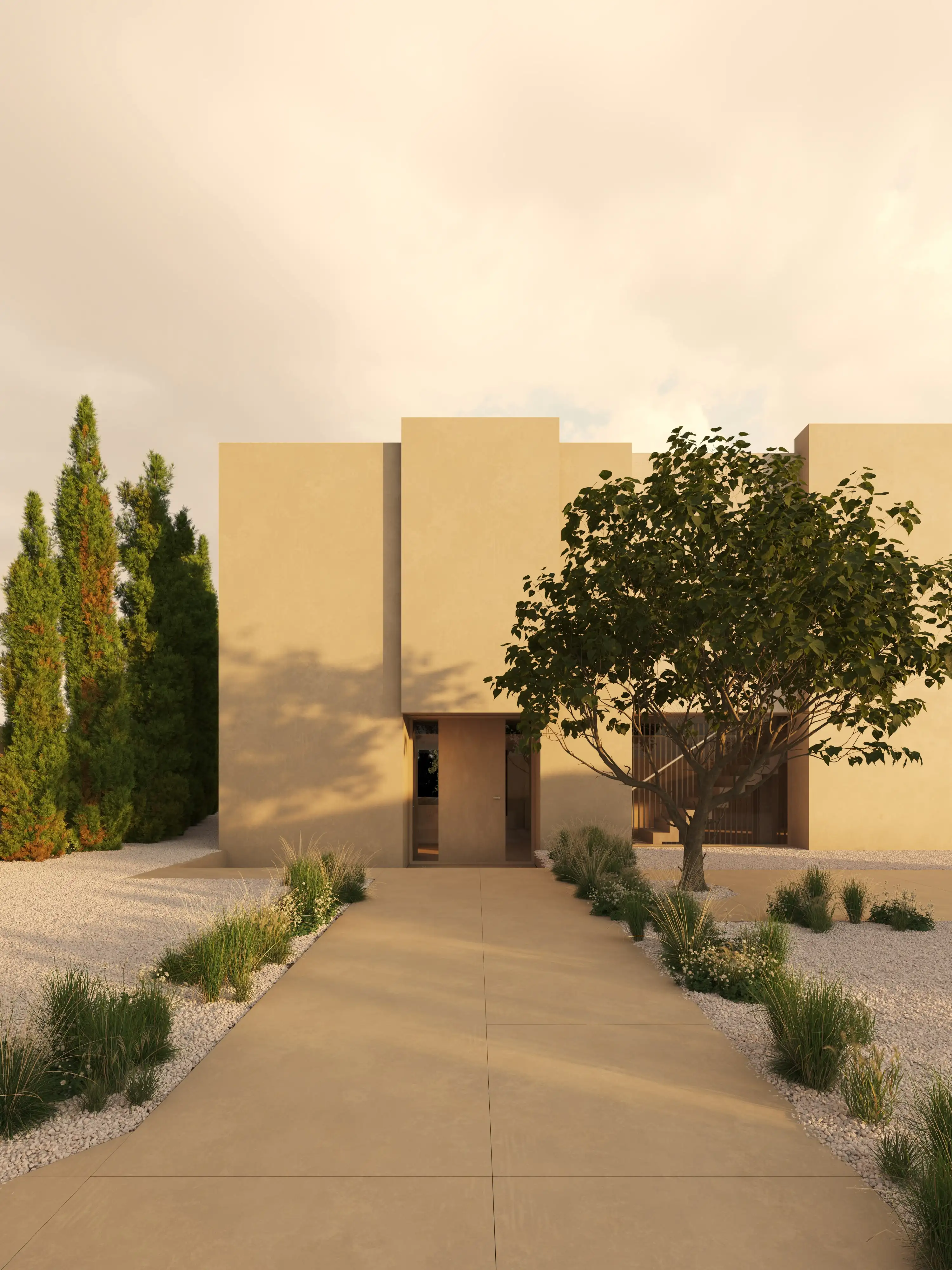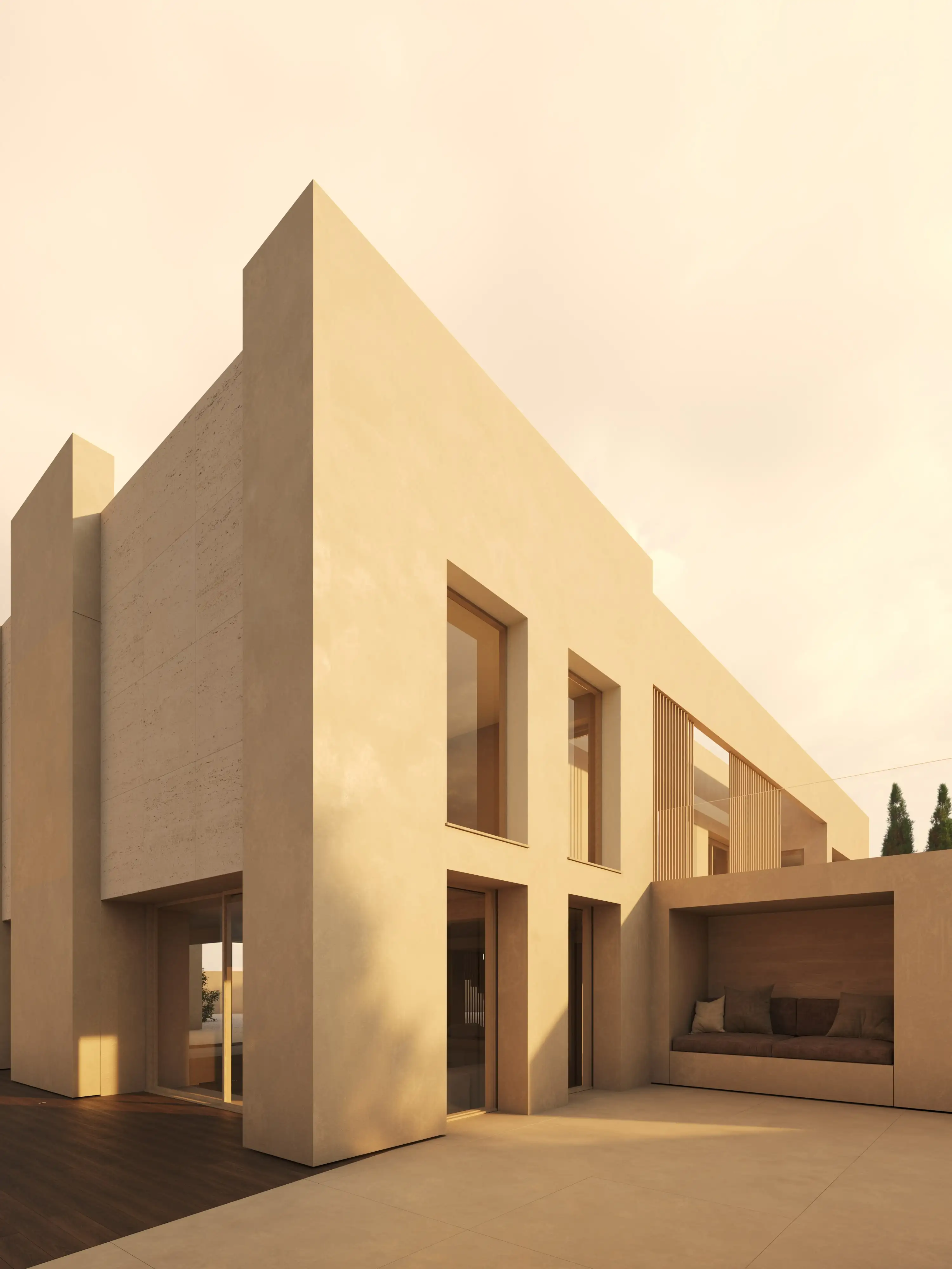 Además, los diferentes espesores de este trasdós, permiten generar un juego geométrico de entrantes y salientes en fachada, lo que otorga la imagen de la vivienda. Estos paños se tratan materialmente de forma distinta en función de su posición, permitiendo generar un juego entre el uso de piedra natural y mortero de cal.