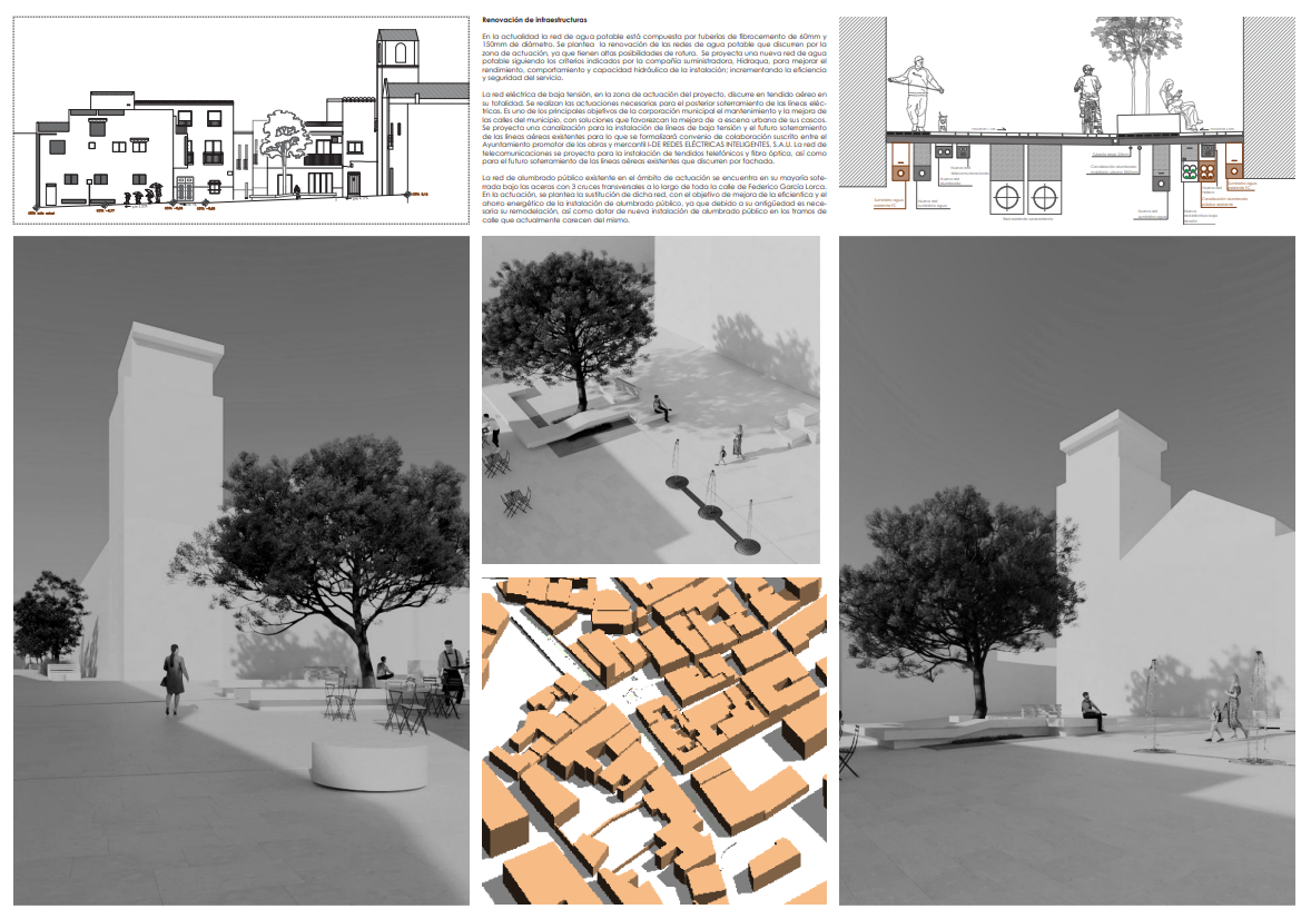 Los materiales seleccionados buscan continuidad con el carácter mediterráneo del municipio, integrándose en el tejido histórico sin renunciar a soluciones contemporáneas. La diferenciación entre zonas de estancia, descanso y circulación se realizará mediante distintos pavimentos, reforzando la funcionalidad del espacio.