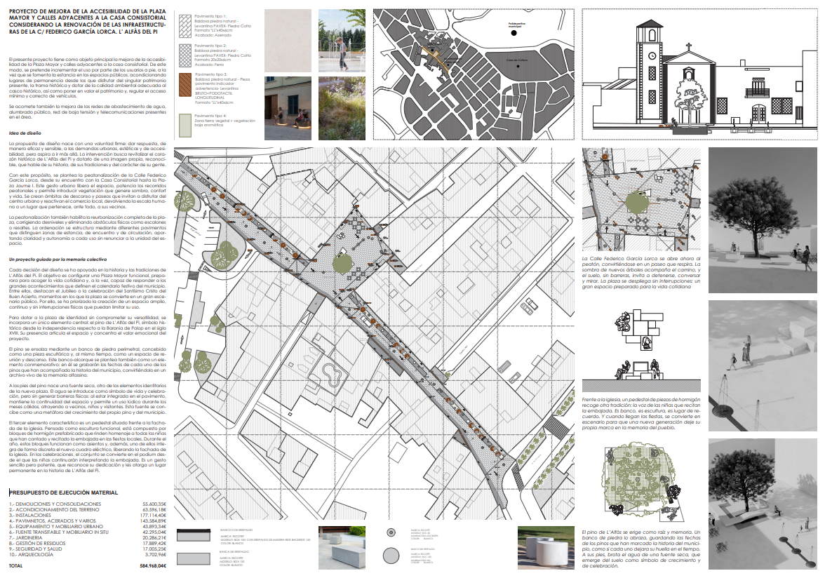 El proyecto parte de una necesidad clara: el casco antiguo de l’Alfàs del Pi presentaba limitaciones de accesibilidad y una configuración urbana fragmentada entre calzada y acera. Nuestra propuesta apuesta por una plataforma única que unifica todo el espacio público, eliminando desniveles y barreras. Esto permite que personas con movilidad reducida, carritos de bebé o cualquier otro usuario puedan moverse con total libertad por el centro histórico. La inversión municipal asciende a 777.896,67 euros, la obra está siendo ejecutada por la empresa Pavasal y el plazo de ejecución está fijado en seis meses.